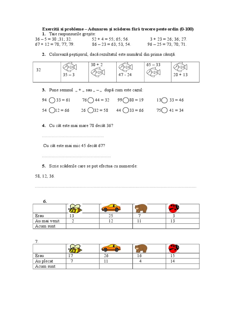 Adunarea Si Scaderea Numerelor Naturale De La 0 La 100 Fara Trecere Peste Ordin