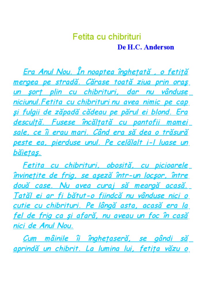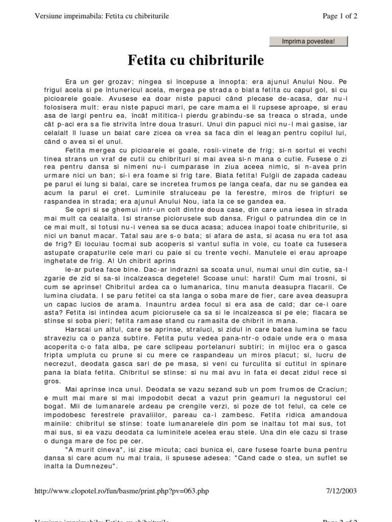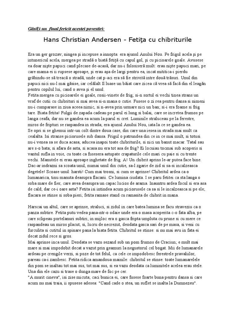 Povestiri Pe Scurt De Lecturi școlare Fetița Cu Chibrituri