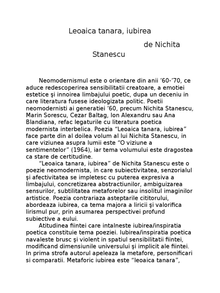 Leoaica Tanara Iubirea De Nichita Stanescu