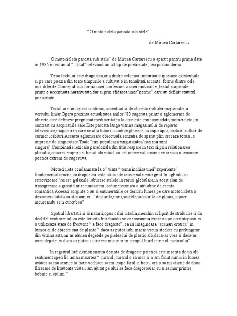 O Motocicleta Parcata Sub Stele De Mircea Cartarescu Liceunet Ro