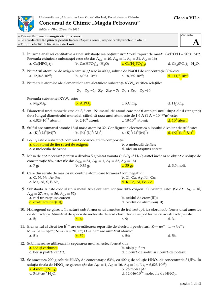 Subiecte Rezolvate Chimie Clasa A Viii A