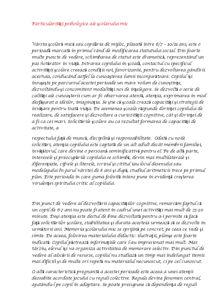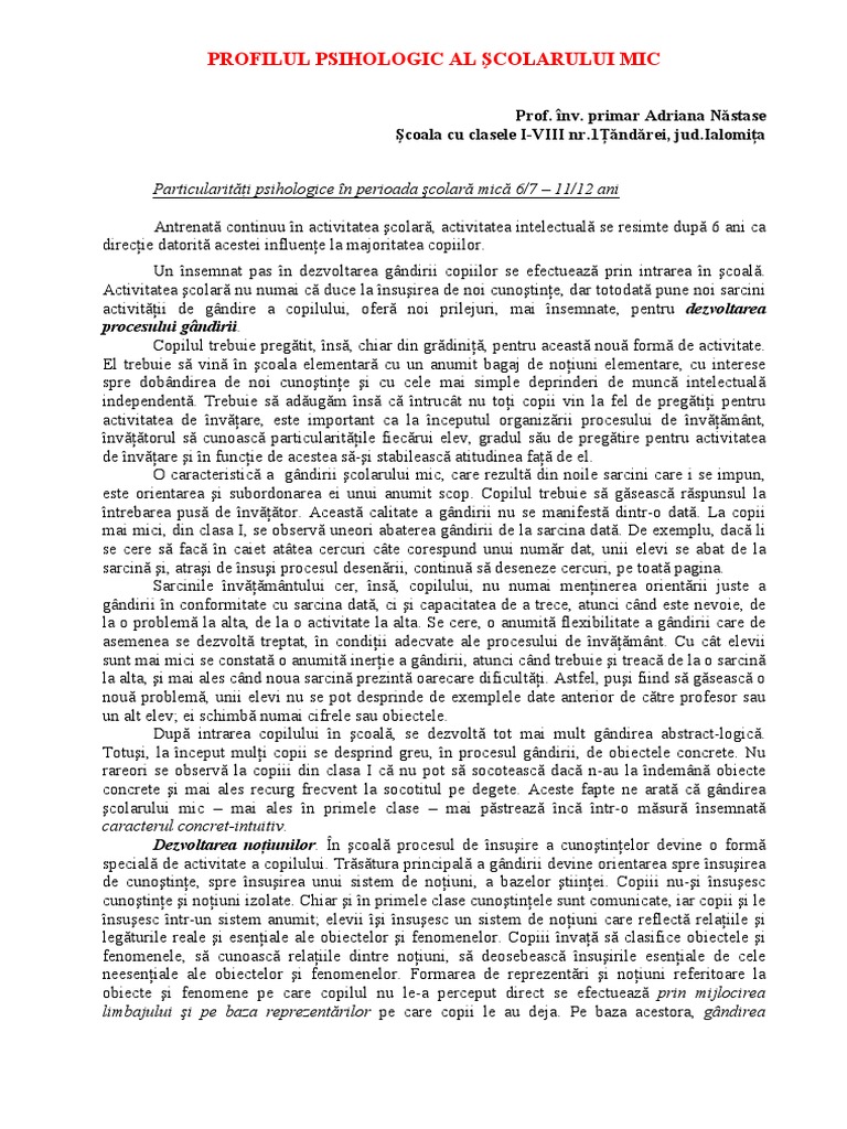 Profilul psihologic al scolarului mic. Dezvoltarea psihică a copilului se realizează în stadii fiecare stadiu caracterizându se printr o configuraţie proprie de procese şi însuşiri psihice. Arhiva contine 1 fisier doc de 34 de pagini. Profilul psihologic al scolarului mic profilul psihologic al scolarului mic a cunoaste in mod precis fiintele asupra carora trebuie sa didactica pedagogie. Profilul psihologic al şcolarului mic dezvoltarea fizică şi influenţa asupra dezvoltării psihice grădiniţa cu p p.