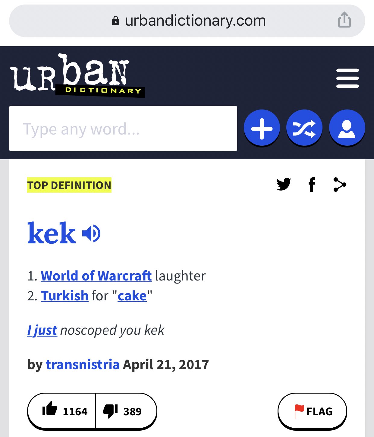 Urban Dictionary On Twitter Deceptibonk Kek Kek Literally Translates To Lol On World Of Warcraft When Some Https T Co Yxft3mkwrm Https T Co Harj2uswoy